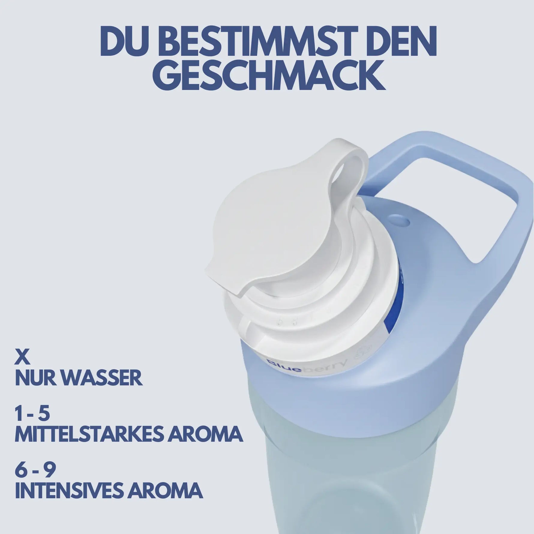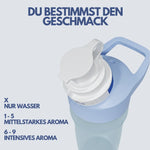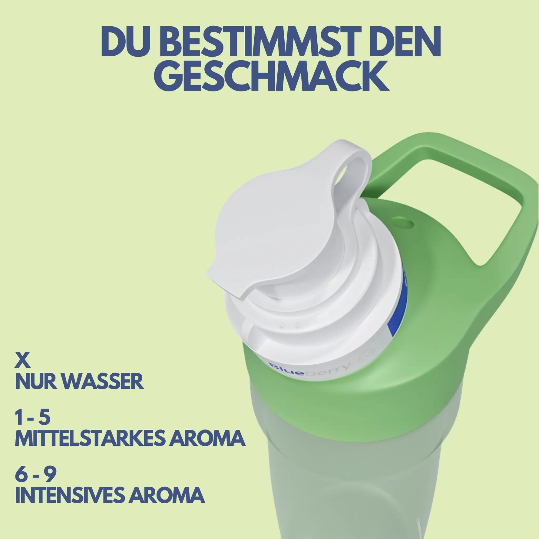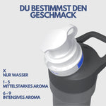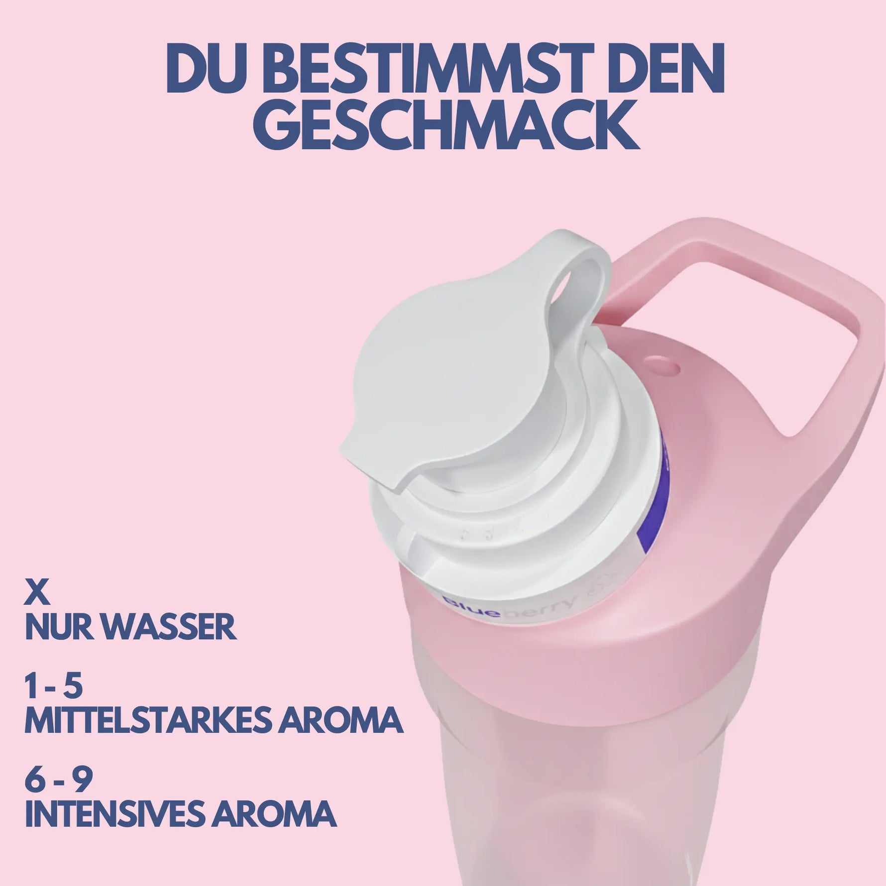 Der Infused Pod sitzt im Deckel der Flasche und gibt beim Trinken flüssiges Aroma ab. Mit dem Drehregler steuerst du selbst, wie intensiv es schmeckt.