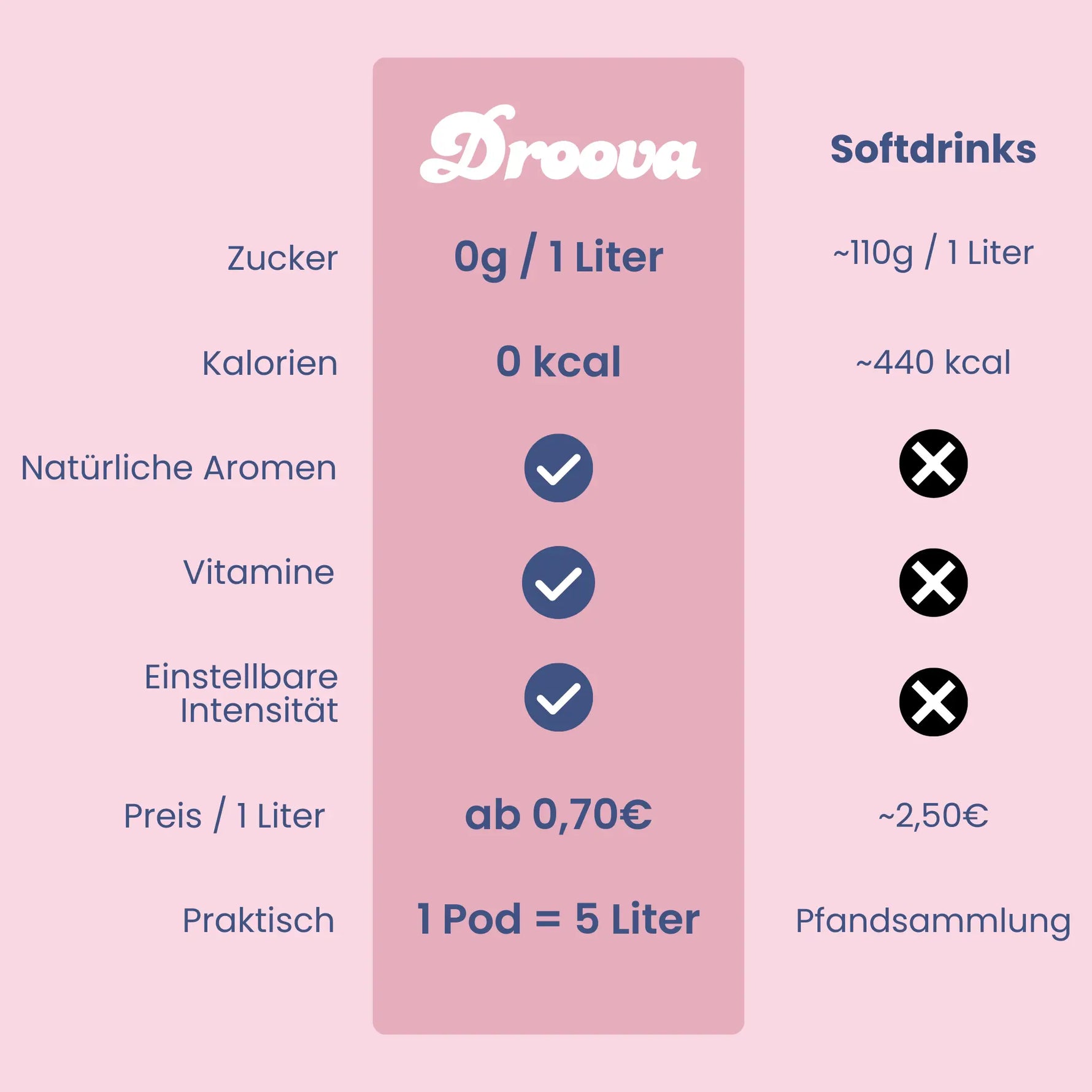 Vergiss langweiliges Trinken. Mit Droova Infused bekommst du intensiven Geschmack, wertvolle Vitamine – ganz ohne Zucker, ganz ohne Aufwand.